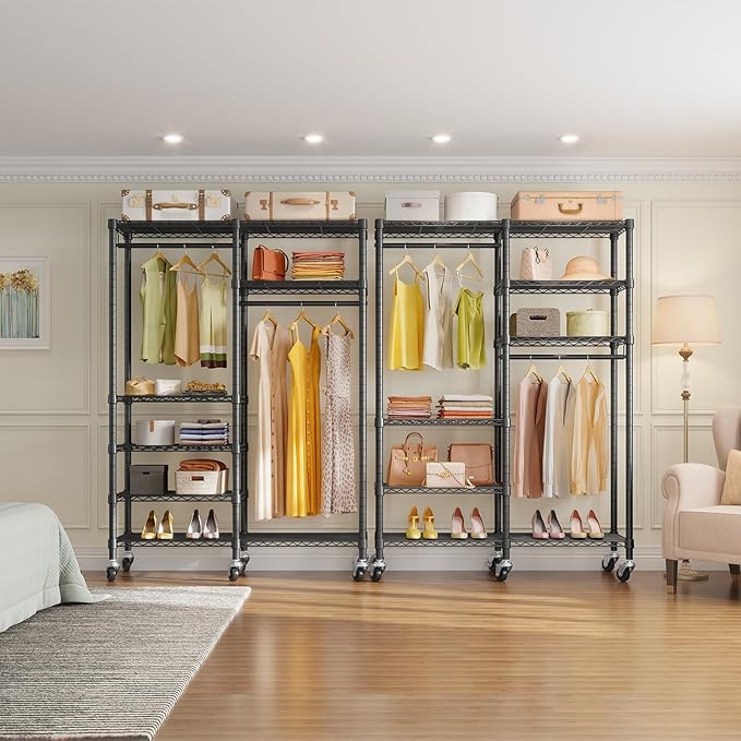- STRONG BEARING CAPACITY: The dimensions after installation are 46.1"Lx17.7"Wx78.3"H, weight capacity up to 620LBS, not easily deformed. It equipped with 6 rolling wheels, 2 of them are locking wheels, designed to allow you to roll this clothing garment rack where ever you need in home.