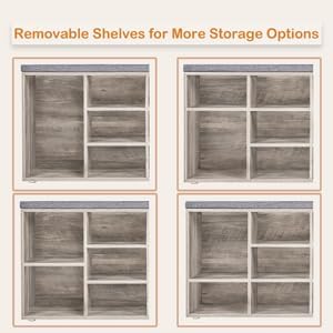 - 【Adjustable Shelves for Multiple Needs】3 middle compartments are fixed size for sneakers, high heels and sandals; shelves on both sides of the entryway bench are adjustable to 3 heights for storing boots or baskets; provide more shoe storage options for different sized shoes