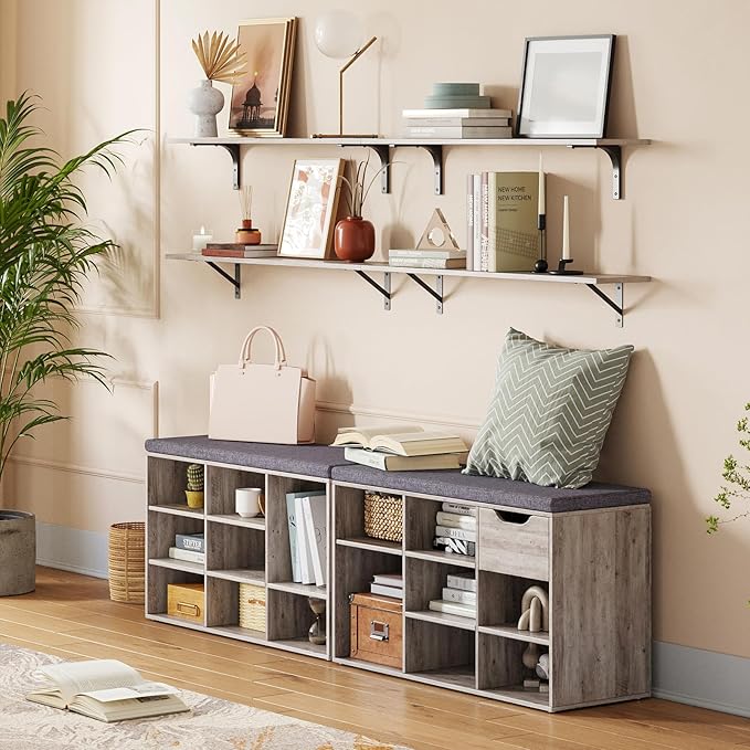 - 【Functional Shoe Bench】Comes with 9 cubbies to store 7-9 pairs of shoes; a perfect storage solution to keep your room neat and uncluttered; matches perfectly with your furniture; spacious storage is ideal for entry porch, front door, living room, bedroom, garage, closet and more
