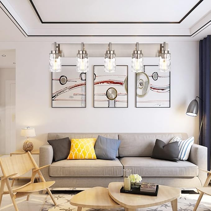 - ⏩ Modern & Unique Design:This 5-light farmhouse bath wall vanity light fixture has clear hammered glass shades and a rich finish that creates a farmhouse look in your space.The glass shades bring a refined vintage feel to any room and simple yet elegant metal finish with clear hammered glass shades lends itself to placement in a bathroom, entryway, or dining room, bringing a modern farmhouse vibe to space.It can be mounted in the up or down position.