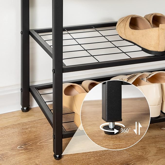 - Elaborate Details: The coat and shoe rack with adjustable feet that keep it level even on uneven floors while prevent tiles, wooden floors, etc. from being scratched