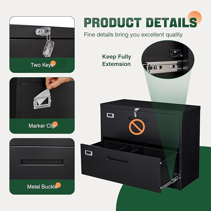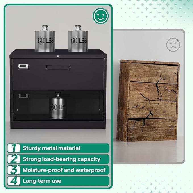 - All-steel Stable-Rustproof:Lateral file cabinet is made of thick high-strength cold-rolled solid all-steel material.Rugged and not easily deformed, powder-coated construction making it immune to corrosion and rust.It is ideal for long-term use