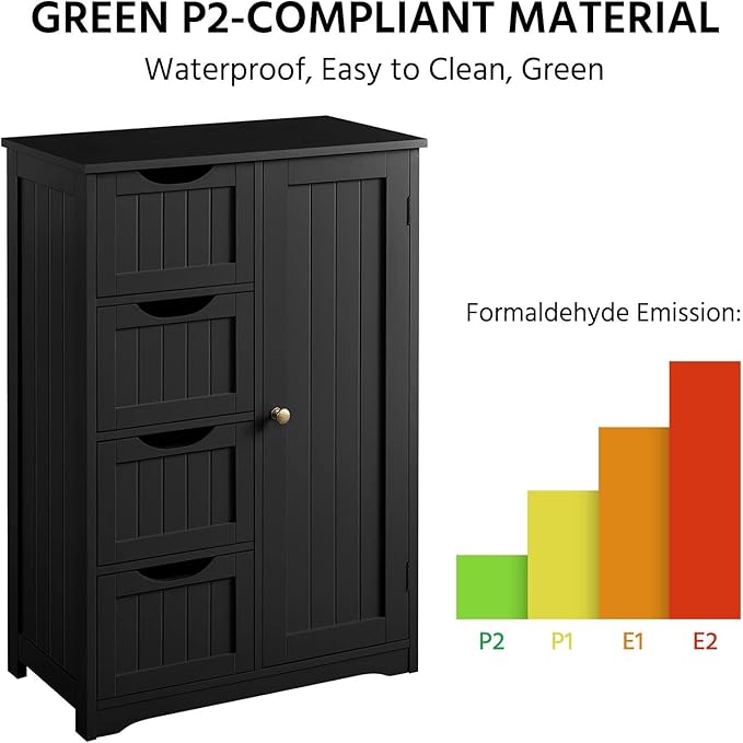 - Space saving: Four drawers with cutout handles and one cupboard with a customizable shelf for you to organize different items like cosmetics, toiletries, towels, toilet paper, etc. A great option for tucking away clutter