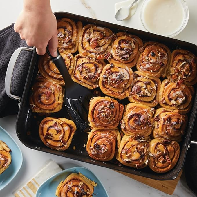 - BUILT-IN POUR SPOUT: Nonstick pan features a built-in corner spout to easily pour juices and homemade gravies