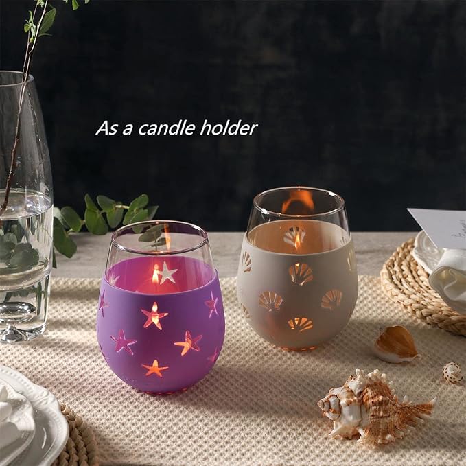 - Large 20 ounce size. Set of 4 stemless wine glasses with silicone protection sleeve which protect tabletops and provide a no-slip grip.