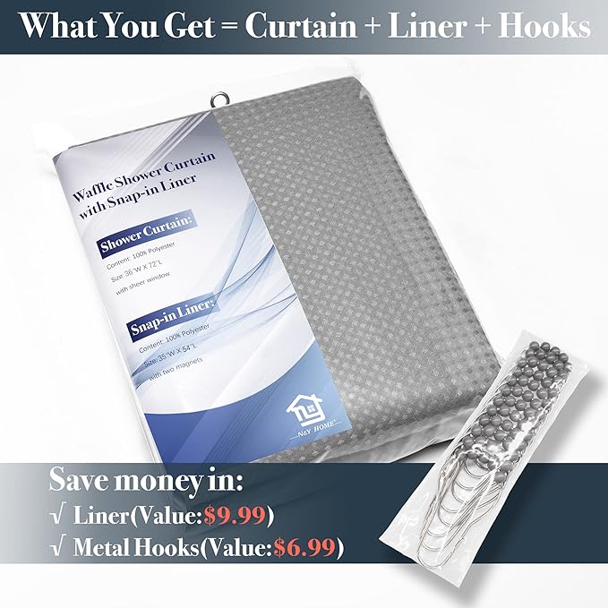 - Smart Design Set & Hotel Style: 36x72 Stall size waffle weave shower curtain with detachable liner, and free 12 rust resistant metal hooks set, the entire 3-in1 set offers a complete solution for bathtub or shower stall bathroom