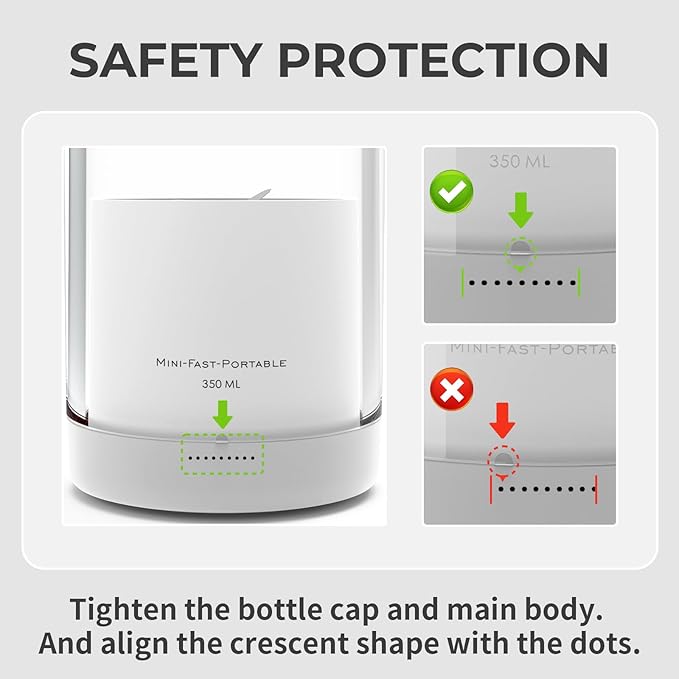 - Safety Protection Device: There is a safety protection device at the bottom of the blender. If the bottle and motor are not tightened, to avoid injury, the machine will not work, and the power button at the bottom will flash red as a reminder. Please tighten according to the instructions in the second main picture