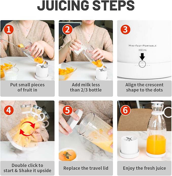 - Easy to Clean and Operation: The personal blender can be opened up and down. You can open the cap to drink and open the bottom to clean.The small blender is simple to operate, with only one button.Double click the switch to turn on the power.When working,you can shake the bottle by holding it at 45 degrees for better mixing.The single stirring time is 30 seconds