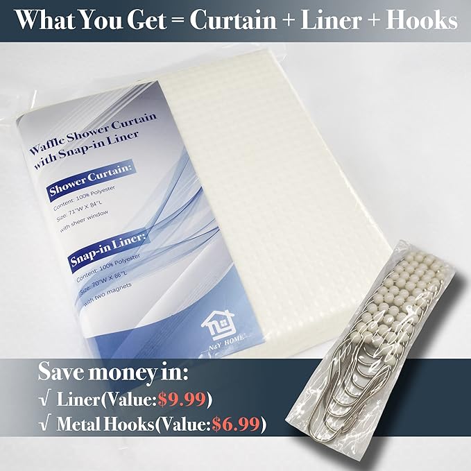 - Smart Design Set & Hotel Style: Extra long waffle weave cream shower curtain with detachable liner, and free 12 shower hooks set, the entire 3-in1 set offers a complete solution for bathtub or stall