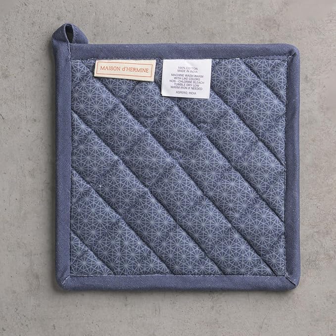 - Package Includes: Set includes 2 pot holders measuring 8" x 8", perfect for handling hot pots, pans, and dishes safely. Made from 100% cotton for reliable heat protection and durability. Designed in Europe and made in India
