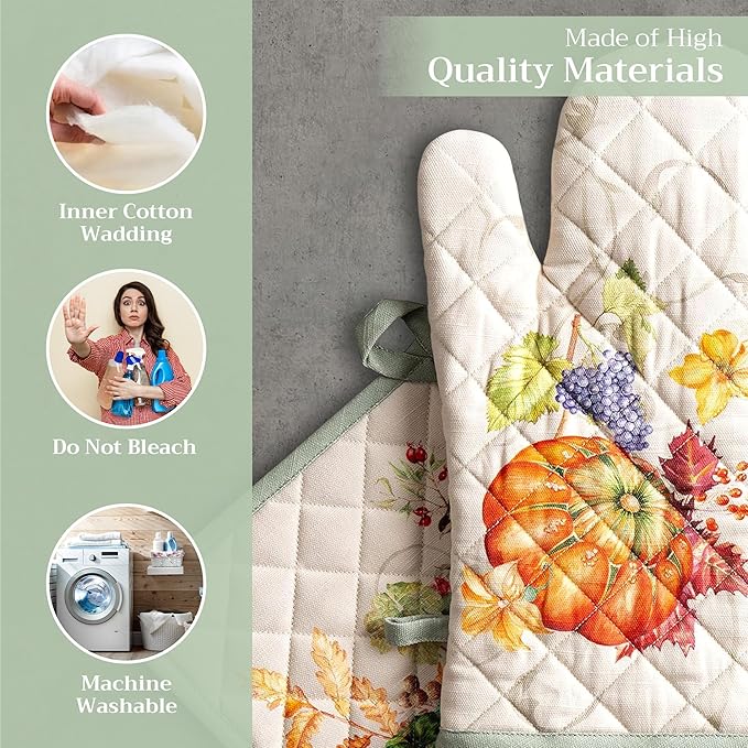 Maison d' Hermine 100% Cotton Oven Mitt & Pot Holder Set (7.5"x13" & 8"x8") Heat Resistant BBQ Cooking Gloves with Loop for Thanksgiving Christmas Decorations Handling Hot Pans (Lumina)