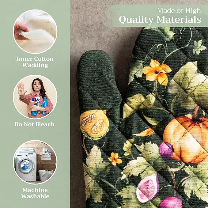 Maison d' Hermine Oven Gloves 100% Cotton Oven Mitt 7" x 13" with Loop Heat Resistant Cooking Gloves for Thanksgiving Christmas Decorations Handling Hot Pans (Pack of 1, Pumpkin Garden - Dark Green)