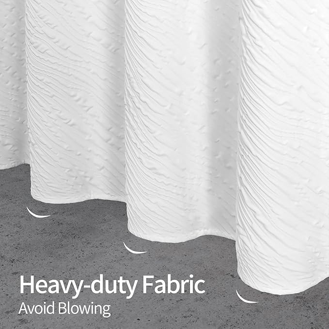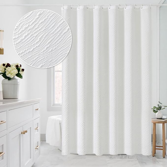 - Unique Manufacture Fabric - 3D embossed texture creates farmhouse like effect for this white shower curtain. The quality curtain is elegant and soft, which can deliver a hotel-like bathroom environment.