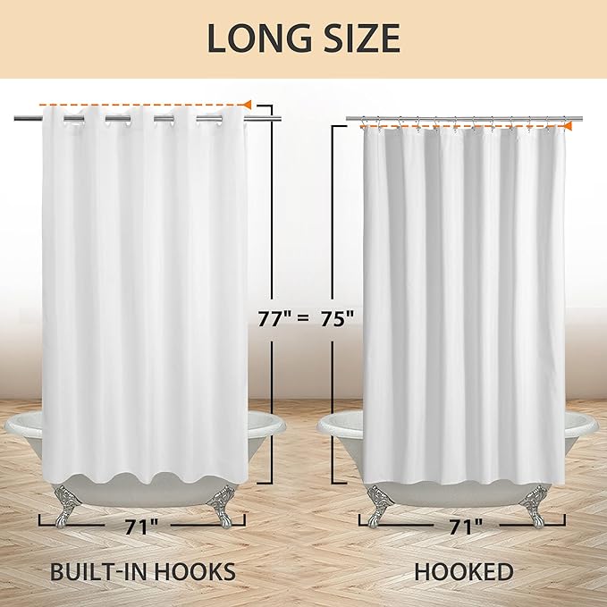 - Easy Care: Machine washable shower curtain with NO HOOKS NEEDED design allows easy installation and removal for cleaning, 71x77(71x75) long size fits tall bathrooms