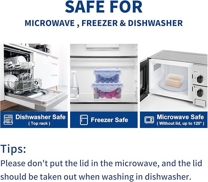 - MICROWAVE,FREEZE,DISHWASHER SAFE:Our containers can tolerate rapid temperature changes from -4℉ to 248℉.Kindly suggest that you should remove the lids before using in microwave and dishwasher.