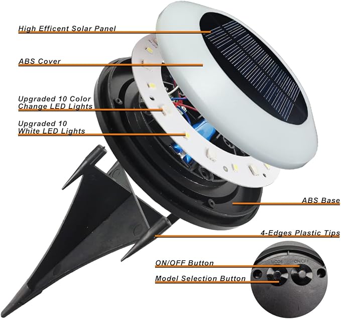 - 【Color Holding Functions 】7 vivid colors and 2 rainbow modes to match any mood you want in your ground, yard, Flower Bed, Terrace, Walkway and Driveway.You can press the button on the bottom to choose any color model you like, and the memory function of lights will keep the model you selected when light up next time.