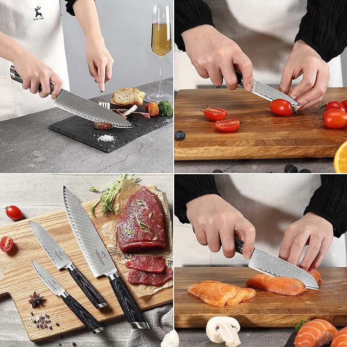 - 【ALL-IN-ONE COMPLETE SET】 Professional Damascus Knife Set includes 8-inch chef's knife, 5-inch Santoku knife, 3.5-inch paring knife, knife sharpener and knife case