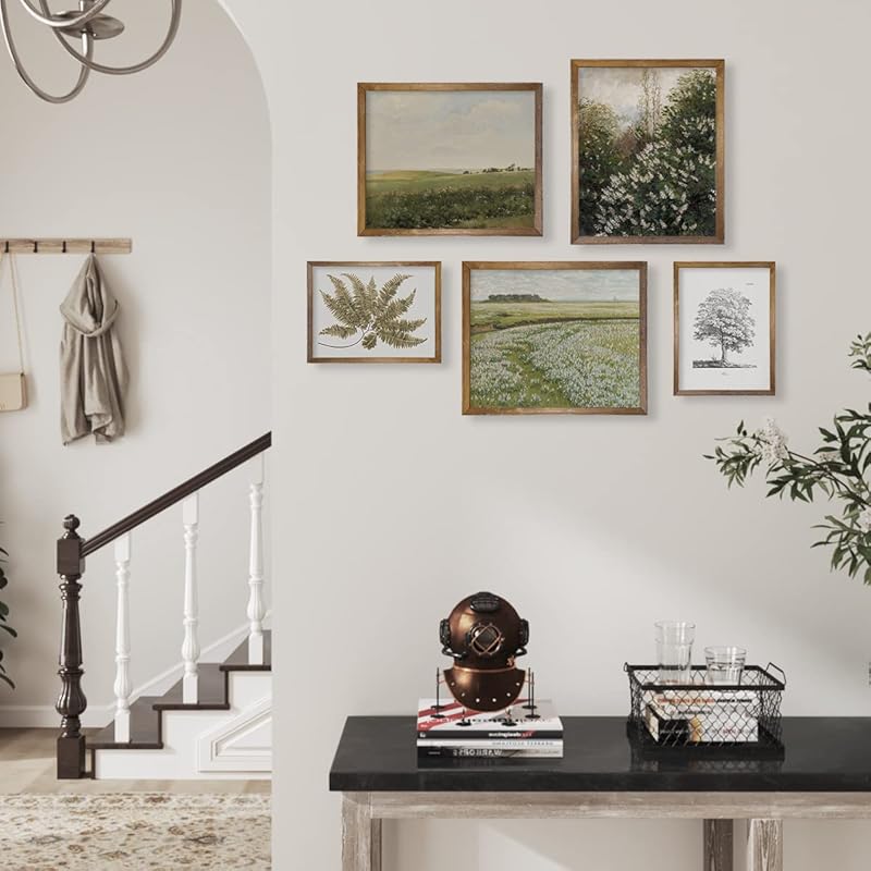 - HOW TO SET THE TONE of your room? How about from the walls out with this unframed france country vintage art set. This 5 pieces print set consists of 3 8x10" and 2 5x7" art prints. Its eclectic themes range from nature landscape, meadow, botanical study to plant drawing. The art set will add a personal flair to your rustic farmhouse or bohemian home. This sage green wall art will be the focal point of your space, inspire conversation when friends visit your home!