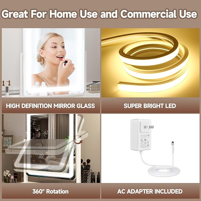 - ✅Suitable for Home and Commercial Use: This LED vanity mirror caters to both personal and commercial needs, making it perfect for use in hair, makeup, and beauty salons. It is also an excellent addition to any home setting, adding a touch of luxury and practicality to any space.