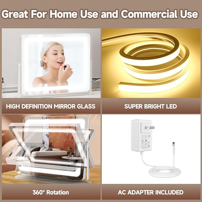 • ✅Adjustable Color Temperature & Dimmable LED Light - Choose your favorite lighting with the touch switch and three choices of color temperature in warm white(2700K),neutral white(3500K) to cool daylight(5500K), it also supports 20% - 100% brightness range for adjustment and lasts 50000 hours continued use. Ideal helper to give the right light for daily makeup,party makeup and other occasions.
