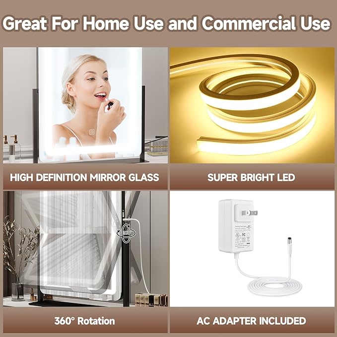 - ✅Suitable for Home and Commercial Use: This LED vanity mirror caters to both personal and commercial needs, making it perfect for use in hair, makeup, and beauty salons. It is also an excellent addition to any home setting, adding a touch of luxury and practicality to any space.