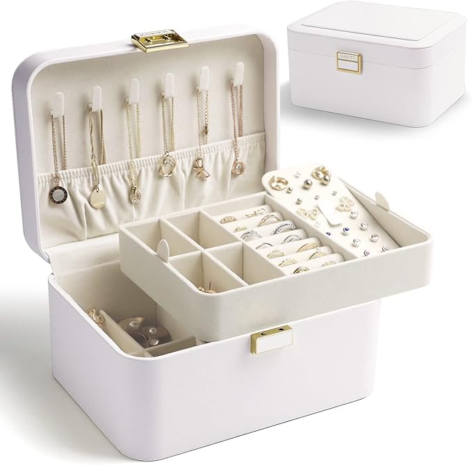 KAMIER Jewelry Box Organizer for Women,2 Layer Jewelry Organizer Boxes for Earrings Bracelets Rings Necklaces,Luxury Leather & Soft Velvet Lined,Gift Box Packaging, White