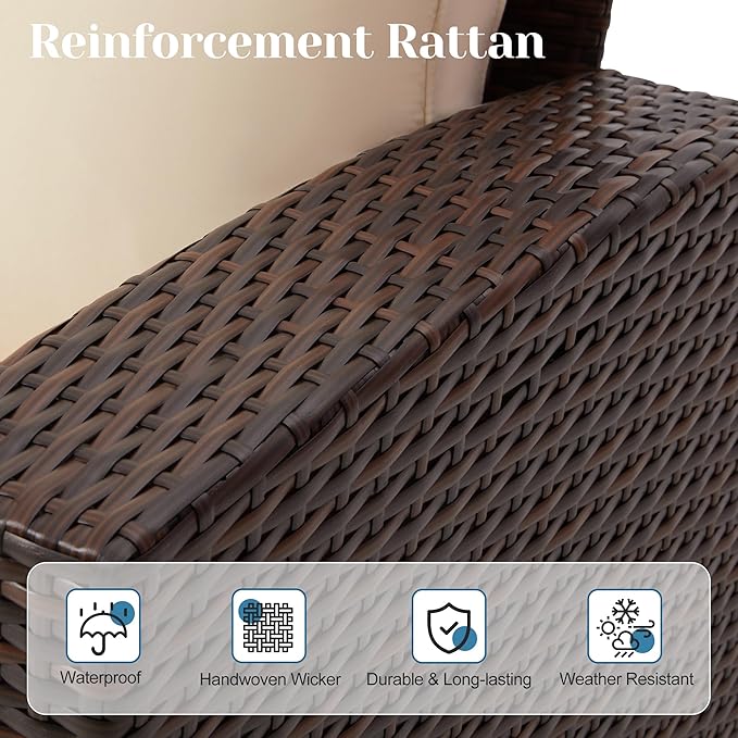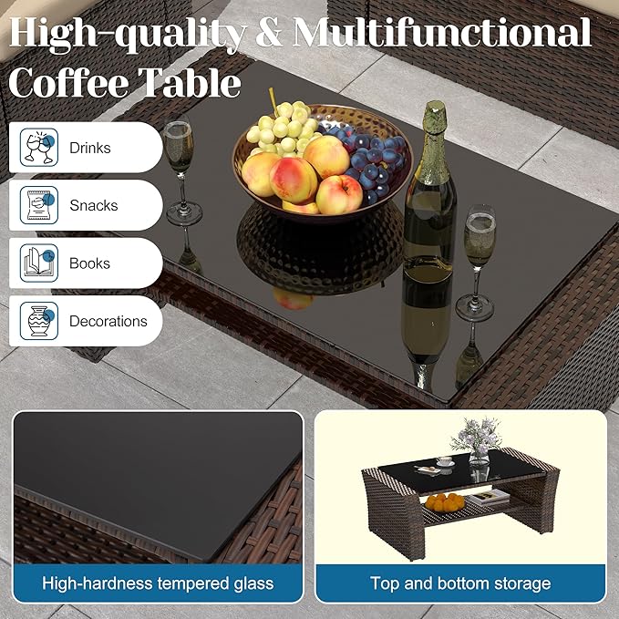 - 【EASY ASSEMBLY & CLEAN】With the detailed instruction, you can assemble the 4 piece outdoor wicker patio furniture sets quickly. And it’s easy to clean because the porch conversation sets feature tempered glass of table, water resistant cushions and removable cushion covers.
