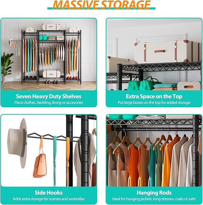 - Adjustable Metal Clothing Rack: The metal wardrobe closet rack with 7 adjustable shelves, 3 detachable hanging bars and 1 side hook to accommodate a range of clothing items. Each shelf can be adjustable, you can adjusted up and down for your needs to store difference sized items, easily accommodates to the length and size of your garments. Easily maximize your storage space