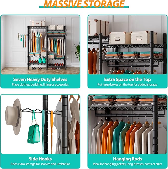 - Adjustable Metal Garment Rack: The freestanding portable clothe rack has 7 tiers adjustable wire shelving, each wire shelving is the same size, you can freely combine them according to your needs for extra storage capacity. 3 detachable hanging bars that easily accommodates to the length and size of your garments. 1 adjustable side hook great for clothing accessories, ties, bags, hats, etc