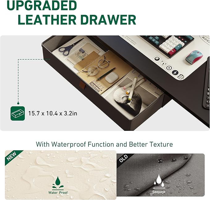 - Storage Drawer: 15.7 inches wide and 3.15 inches high storage space for daily work and life. The upgraded leather drawer with waterproof function and better texture, keep your desk clean and comfortable.