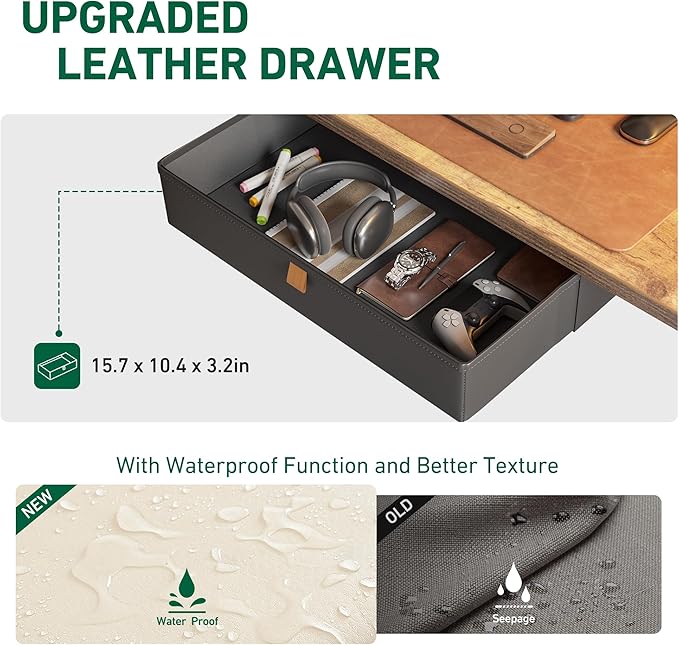 - Storage Drawer: 15.7 inches wide and 3.15 inches high storage space for daily work and life. The upgraded leather drawer with waterproof function and better texture, keep your desk clean and comfortable.