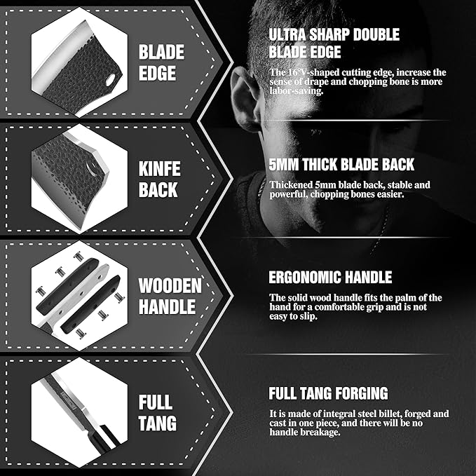- PREMIUM STEEL & SUPER SHARP BLADE - Our razor-sharp meat cleaver knife is forged from excellent German imported high carbon stainless steel 7cr17mov which makes the blade ultra-solid and has a better ability to maintain sharp edges than stainless steel. Hand polished edge at 16° per side, the V-shaped blade edge minimizes cutting resistance, helping you cut food effortlessly. The Chinese cleaver is strong, durable and re-sandable.