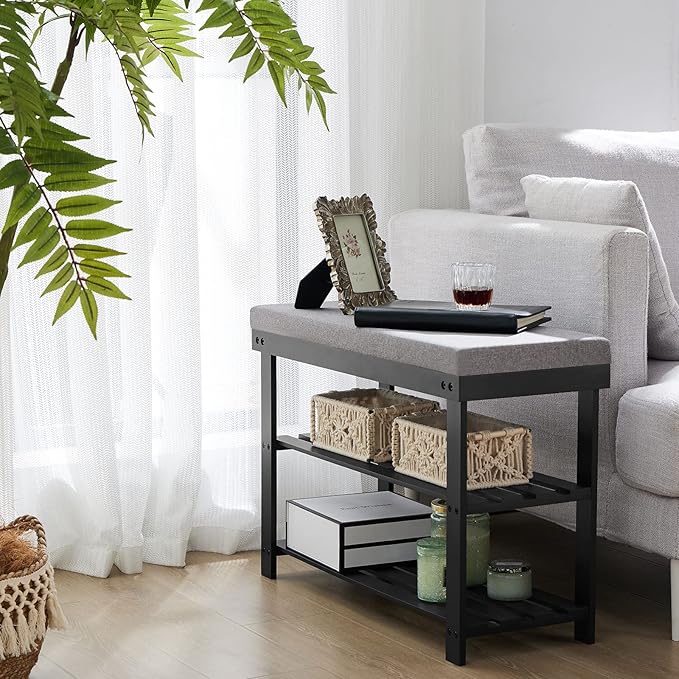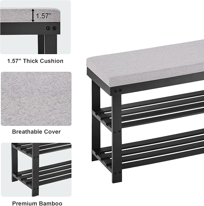 Apicizon 3-Tier Shoe Rack for Entryway, Bamboo Shoe Bench with Cushion Padded Seat, Small Shoe Organizer with Storage for Indoor Entrance Hallway Bedroom Living Room, Black