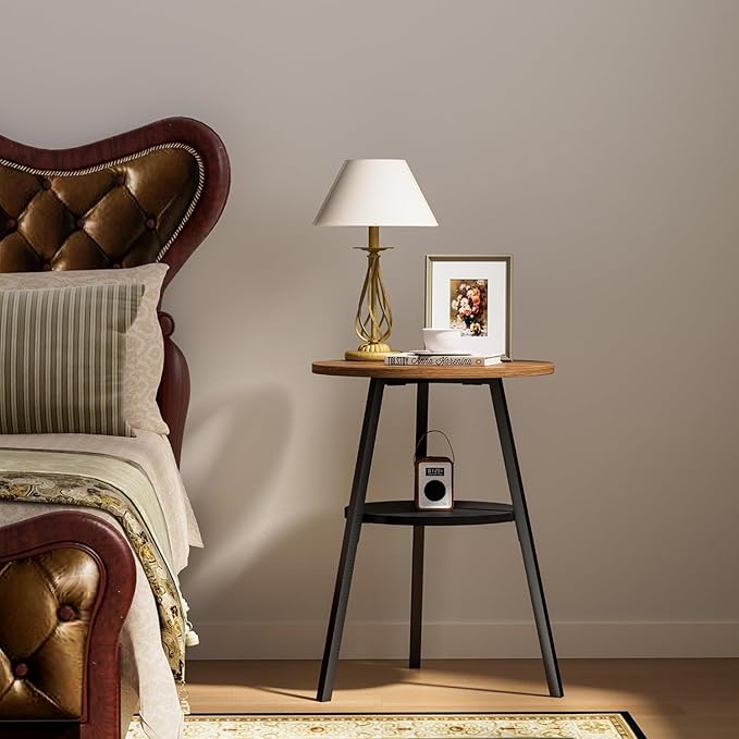- 【Double-Decker Humanized Design】 With 2 tiers on the round end table and a slim figure of 15.4”L x 15.4”W x 21.6”H,this end table is complete with ample storage to hold your things like remote,tablet and books,etc.The fashionable rustic round end table is also a perfect decor for your home.