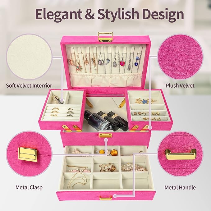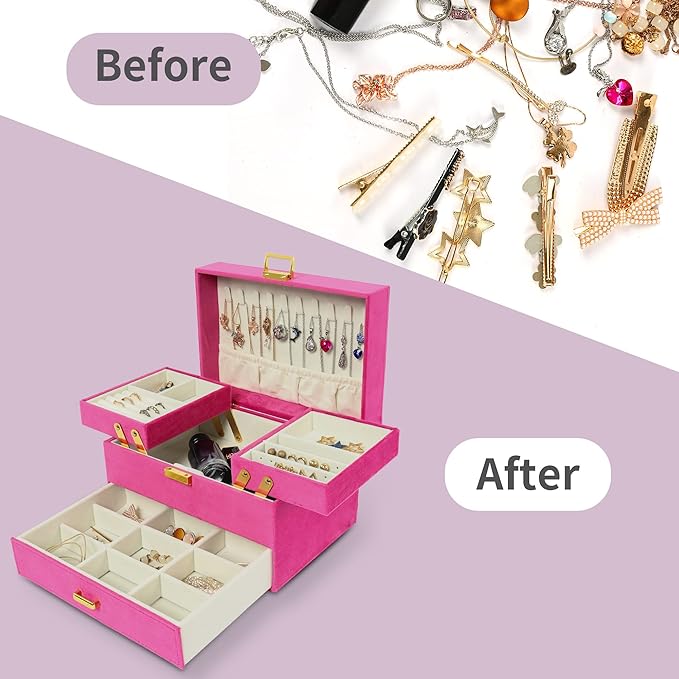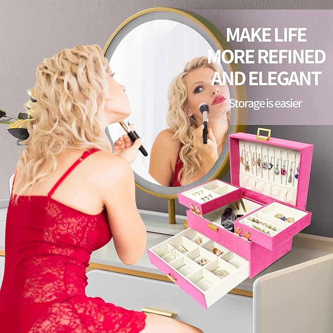 - Space-Saving Jewelry Box: With our 3-layer jewelry box, all your jewelry will be organized and easy to access. From then on, you have a bright dressing table that makes your room look more tidy and elegance. Moreover, the classification design of our large jewelry box organizer allows you to reduce the search time