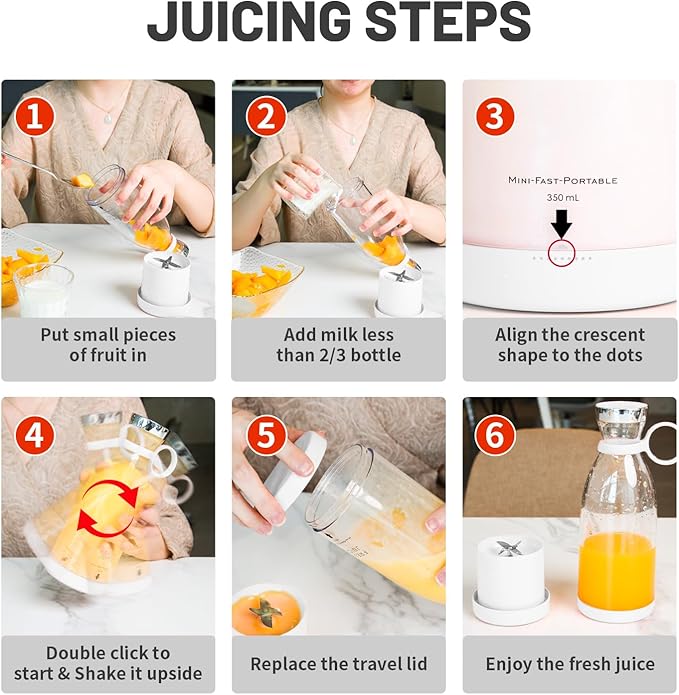 - Easy to Clean and Operation: The personal blender can be opened up and down. You can open the cap to drink and open the bottom to clean.The small blender is simple to operate, with only one button.Double click the switch to turn on the power.When working ,you can shake the bottle by holding it at 45 degrees for better mixing.The single stirring time is 30 seconds
