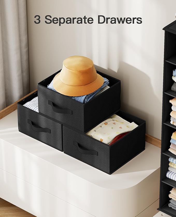 - 3 REMOVABLE DRAWERS: The closet organizer and storage includes 3 removable drawers that fit inside or can be used separately for storage. 3 mesh pockets are located on the outside of the organizer for small items and clothing.