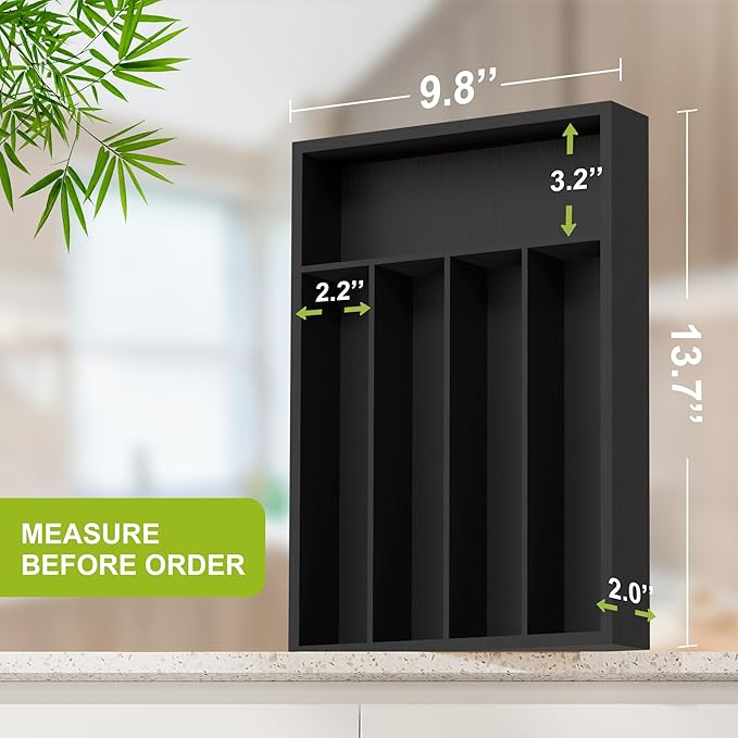 - 🎄EFFECTIVE USE OF SPACE - The bamboo cutlery tray is suitable for home and workplace. The tray features an ingenious design to help you organize your flatware, cutlery and kitchen gadgets without creating a mess in the drawer Moreover, our bamboo utensil holder organizer looks orderly, with clear levels, allowing the space to be used rationally. this cutlery tray with black luxury can help you save storage space and improve the aesthetics.