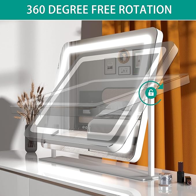 Hasipu Vanity Mirror with Lights, 24.2" x 18.9" LED Make up Mirror, Light up Mirror with 10X Magnification and USB Charging Port, Phone Holder, Smart Touch 3 Colors Dimmable, 360° Rotation (White)