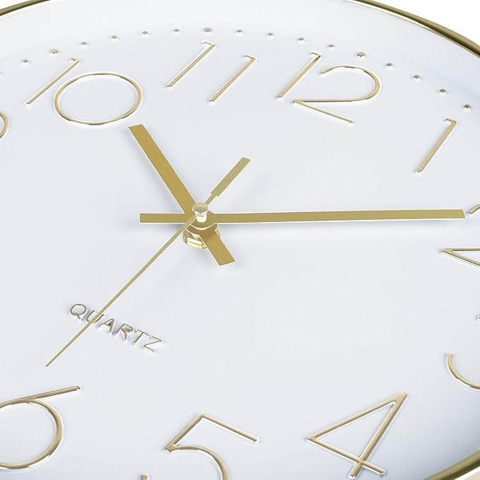 - Modern & Simple: The electroplated gold frame, classic clock hands and 3D numbers on the white dial show modern and minimalist aesthetics. Simplify your life with this simple contemporary wall clock.