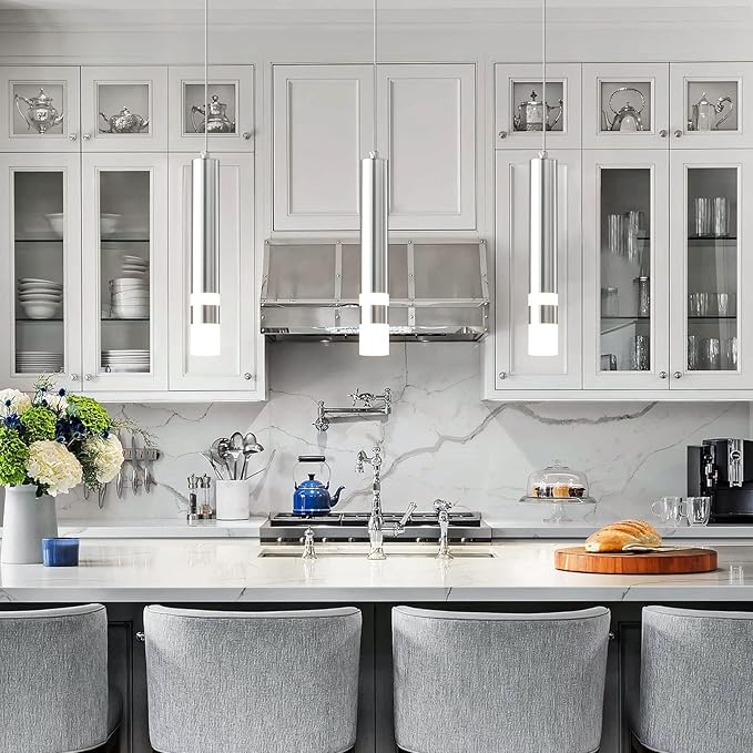 - 【Modern Minimalist Design】Exquisite chrome pendant lights consist of a layer of aluminum tubes coated with electroplated paint on the surface, and the lampshade is paired with high transmittance acrylic columns, with a modern style. Beautiful and durable lighting fixtures make your kitchen island look simple, fashionable, and high-end atmosphere