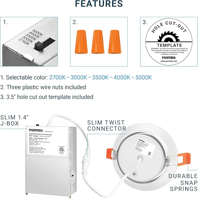 - 5 COLOR TEMPERATURE SWITCH: Set the color temperature of your lights to the desired level with a simple flip of a switch on the junction box. Choose between Warm White (2700K), Soft White (3000K), Neutral White (3500K), Cool White (4000K), and Day Light (5000K).