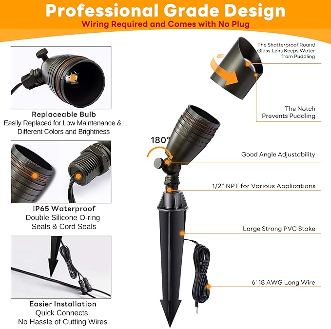 - ๐๐ซ๐ข๐ ๐ก๐ญ: Outdoor spotlights that use MR16 LED bulbs (sold separately) and support up to 50W for powerful illumination. Lights up exterior trees, walls, flags, and fountains. 180ยฐ adjustable while the ground stake stays in place