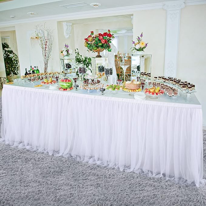 2 Pack 6ft White Tulle Table Skirts for wedding Bridal Shower White Ruffle Tutu Tablecloth for Baby Shower Birthday Party Banquet Baptism Cake Dessert Table Decorations