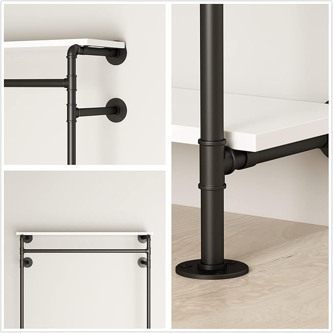 - 【Sturdy & Rustproof】Pipe wall clothing racks are made of high quality black iron pipes and solid wood plates, black pipe coat enhance corrosion resistance and avoid corrosion accumulation. Plank uses solid wood plank, weight capacity is strong, you can place things with confidence.