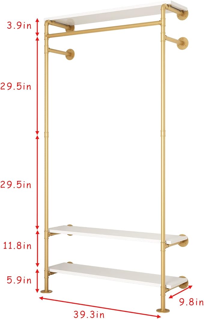 Gold Wall Clothing Racks with White Shelves, Wall Mounted Gold Clothes Rack for Hanging Rods,Heavy Duty Industrial Pipe Clothing Racks With Shelves Retail Display Garment Rack for Home