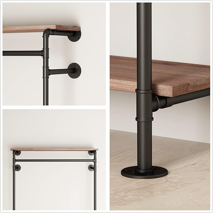 - 【Sturdy & Rustproof】Pipe wall clothing racks are made of high quality black iron pipes and solid wood plates, black pipe coat enhance corrosion resistance and avoid corrosion accumulation. Plank uses solid wood plank, weight capacity is strong, you can place things with confidence.