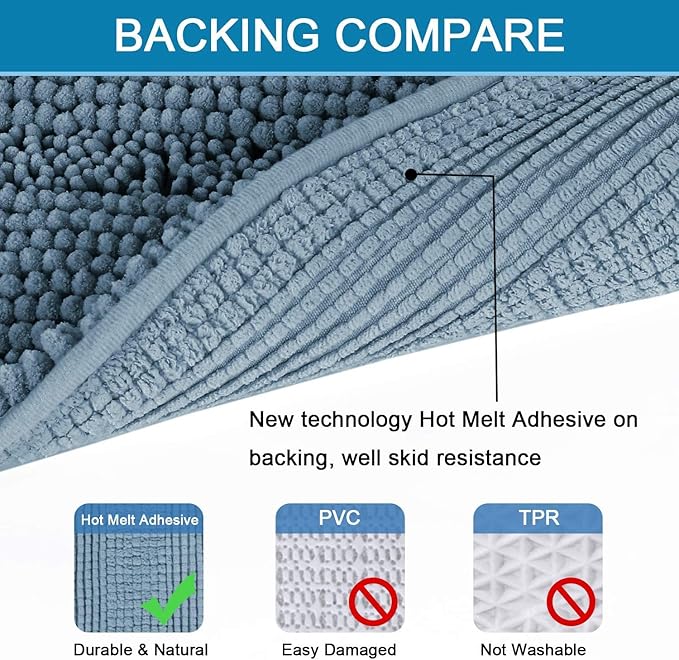- ULTRA THICK: These bath rugs are passed GLOBAL RECYCLED STANDARD certificate. Compare the normal quality 1350g/sm, this plush chenille carpet set is more thick and bushy, quality up to 2000g/sm weight, thus make the bath mats amazing soft and cozy like a comfortable quilt protector for your feet