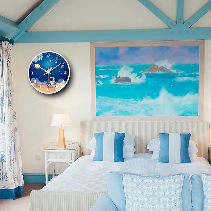 12 Inch Silent Movement Kids Wall Clock, Non Ticking Children Round Wall Clock Battery Operated Space Travel Style Decor Children Clock for Home School Boys Bedroom Living Room (White)
