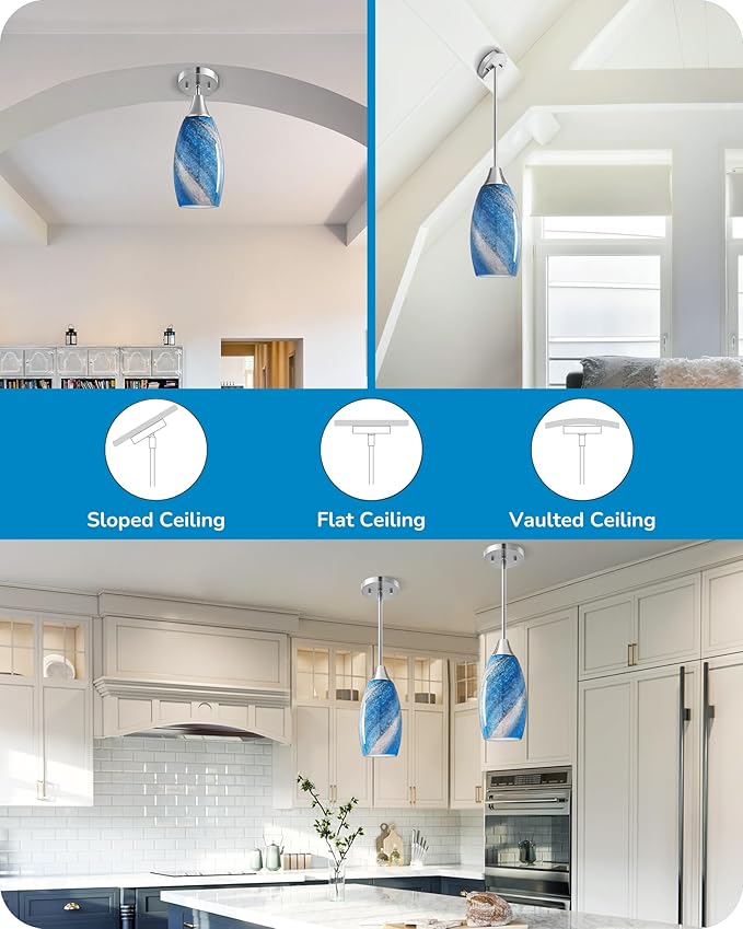 - 【Easy to Install】Comes with a convenient installation pack our pendant light fixture is easy to install, just connect the wires and mount the bracket; wider diameter of the shade opening makes easy to replace bulb; with universal head design, the glass pendant light can be 90° adjustable, and can be installed on a flat or sloping ceiling